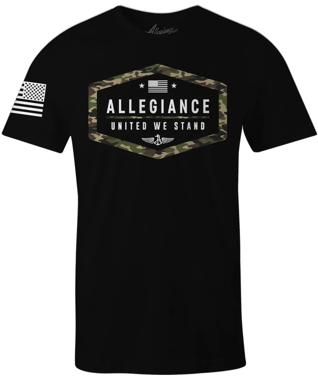Introducing the Allegiance Clothing Camo Republic Tee! This stylish and patriotic tee is perfect for any camo lover in your life. The shirt features our Camo Republic logo screen printed large on the front, with a small classic logo on the back. The shirt also has an assaulting American Flag on the sleeve, adding some extra patriotism.
