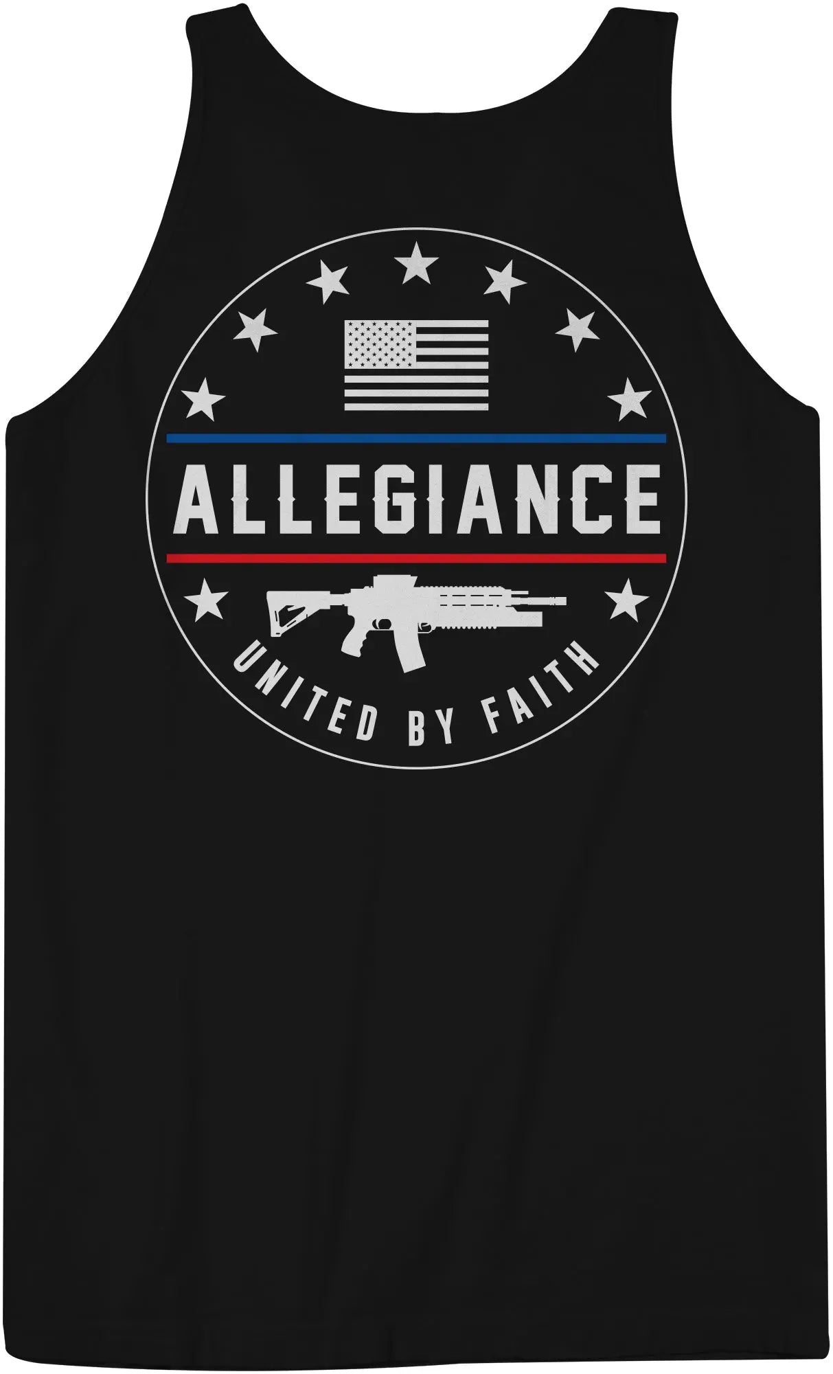 Allegiance Clothing. The Allegiance Combat Back Hit Tank Top. Allegiance Combat small art print screened on front and a big hit on the back. Available in black. Crew neck. 100% cotton. Machine wash. Designed and printed in the USA.