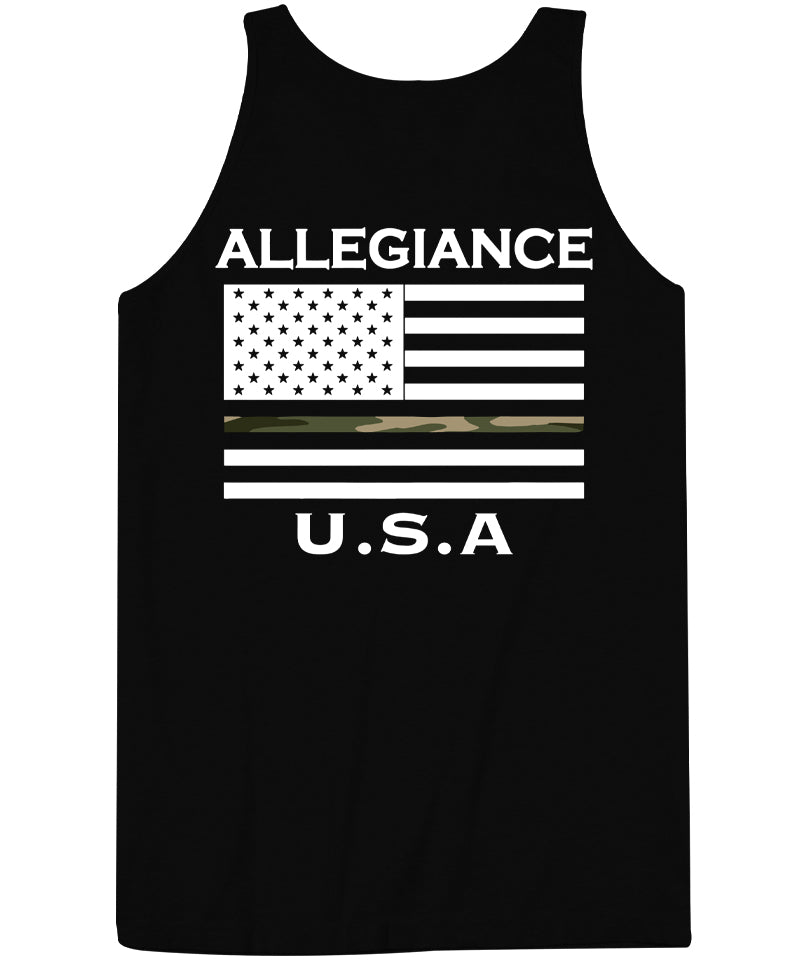 Show your American pride with the Allegiance Camo Line Back Hit Tank Top, a bold and clean design built for everyday wear. The back features a powerful American flag graphic with a camo stripe across the center, giving the tank a rugged military-inspired feel. Because the artwork blends classic patriotism with modern style, it stands out immediately. The large “Allegiance U.S.A.” text reinforces the message of strength and loyalty.
