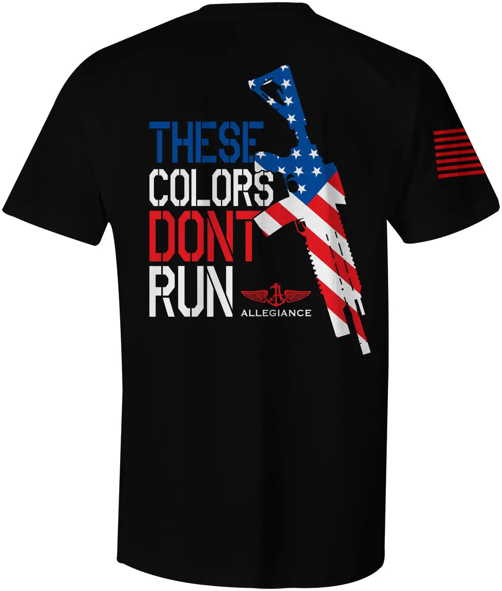 Show your patriotic pride with the Allegiance Don’t Run Back Hit Tee. This bold design features the powerful phrase “These Colors Don’t Run” alongside a rifle filled with the American flag pattern. The back print makes a striking statement, while the American flag on the sleeve reinforces the message of loyalty and strength.